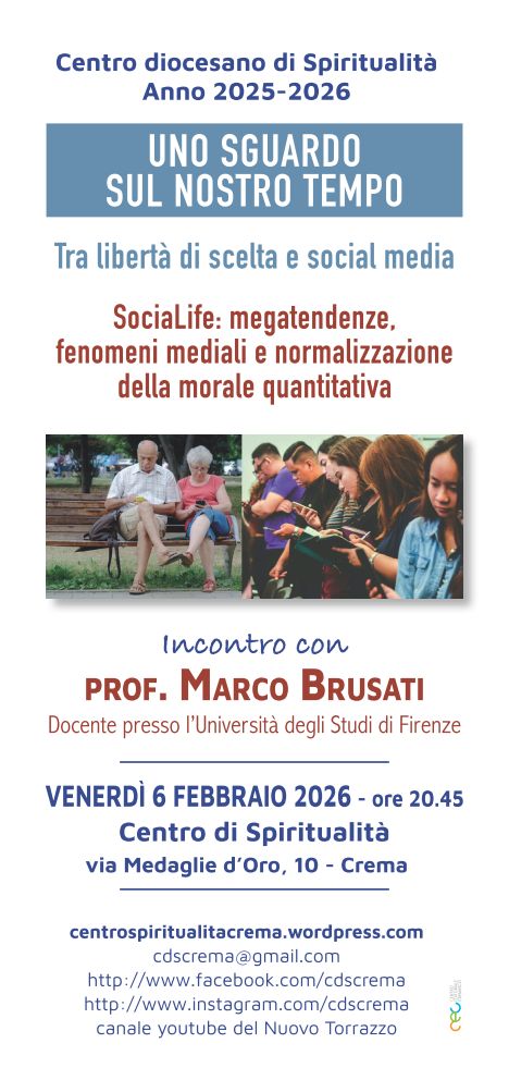 Pubblichiamo la notizia di un incontro – organizzato dal Centro di Spiritualità di Crema – con il prof. Marco Brusati, docente dell’Università di Firenze, sul tema dei social media. L’utilizzo di metriche e dati, quali il numero di like, followers e visualizzazioni, come indicatori di valore sta portando progressivamente all’affermazione di una «morale quantitativa»: una caratteristica dell’ambiente mediale che… Read More