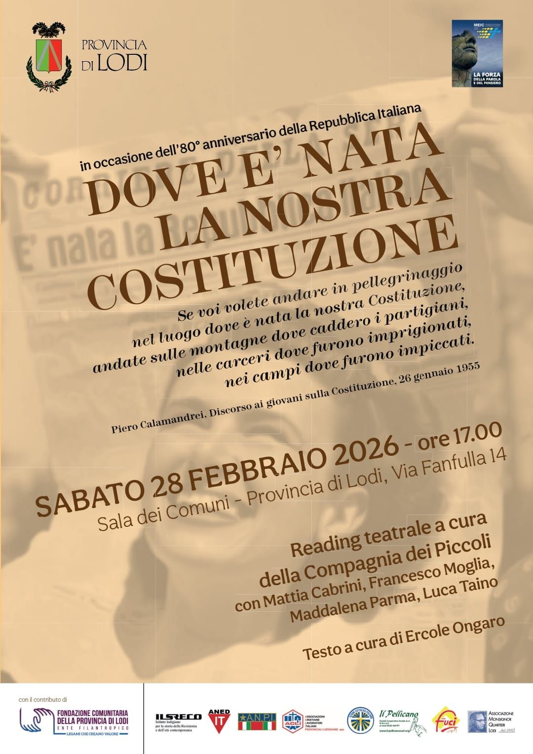 Pubblichiamo l’invito di una manifestazione teatrale organizzata dal Comune di Lodi in occasione dell’80esimo compleanno della nostra Costituzione sabato 28 febbraio alle ore 17.00 nella Sala dei Comuni della Provincia di Lodi in via Fanfulla 14. Read More