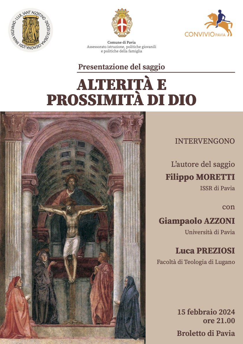 Docenti e studenti sono invitati a partecipare alla presentazione del libro del prof. Filippo Moretti, docente del nostro ISSR “Sant’Agostino” (Polo accademico di Pavia), intitolato Alterità e prossimità di Dio. L’evento si terrà presso il Broletto di Pavia (in piazza della Vittoria) giovedì 15 febbraio alle ore 21.